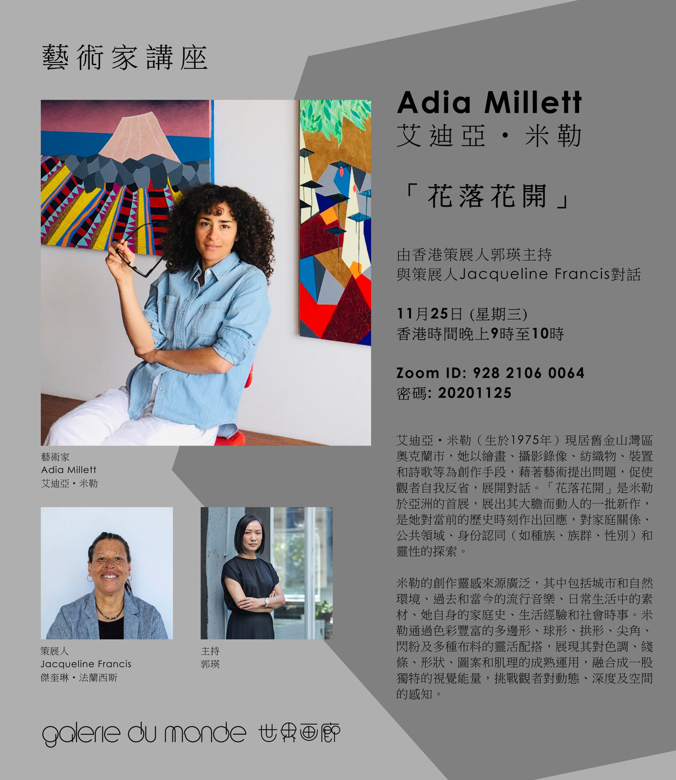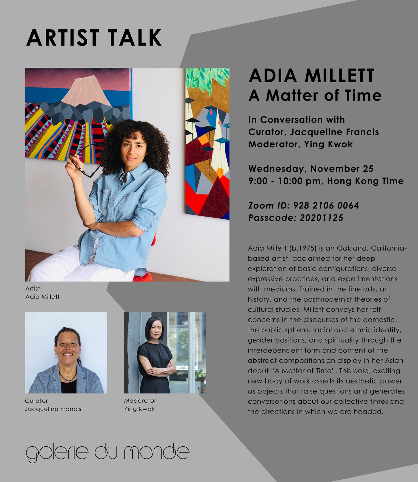 Adia Millett's Asian debut "A Matter of Time" will open at Galerie du Monde on November 19, 2020. As the Oakland-based artist cannot travel to Hong Kong due to the global pandemic travel measures, Galerie du Monde will be hosting an online conversation with Adia Millett and Jacqueline Francis, moderated by Hong Kong-based curator Ying Kwok on November 25, 2020 at 9pm HKT.