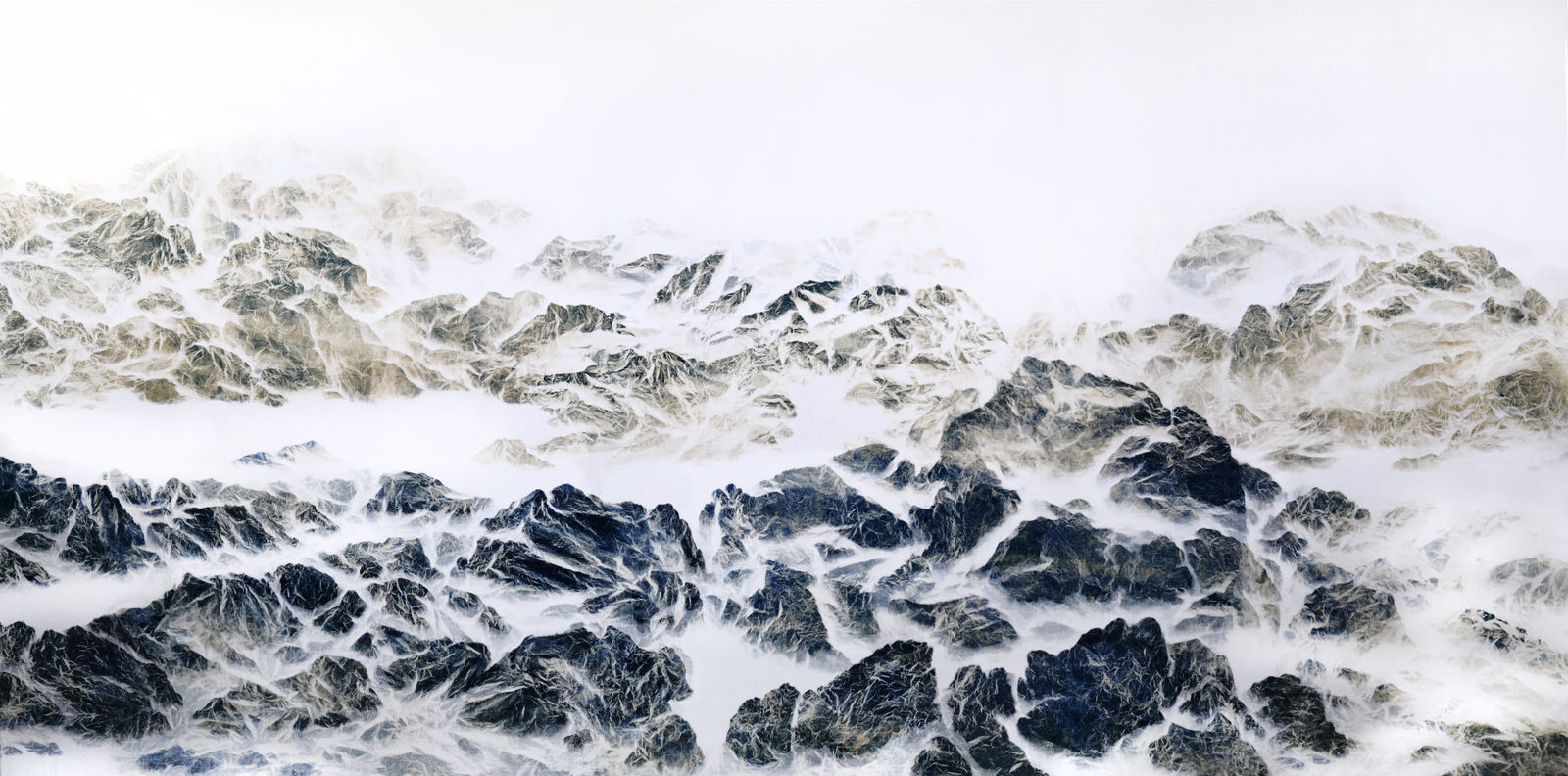 Wu's work explores light and time, and ways to recreate traditional art forms and aesthetics without losing the spirit. Wu began the Cyano-Collage series with the intention to reinterpret the traditional texturing (cunfa) method of Chinese landscape painting. Instead of using ink and brush, Wu utilizes cyanotype to treat his textures on Chinese rice paper (Xuan paper) and collages them onto canvas, resulting in mesmerizing mountain ranges and seascapes.