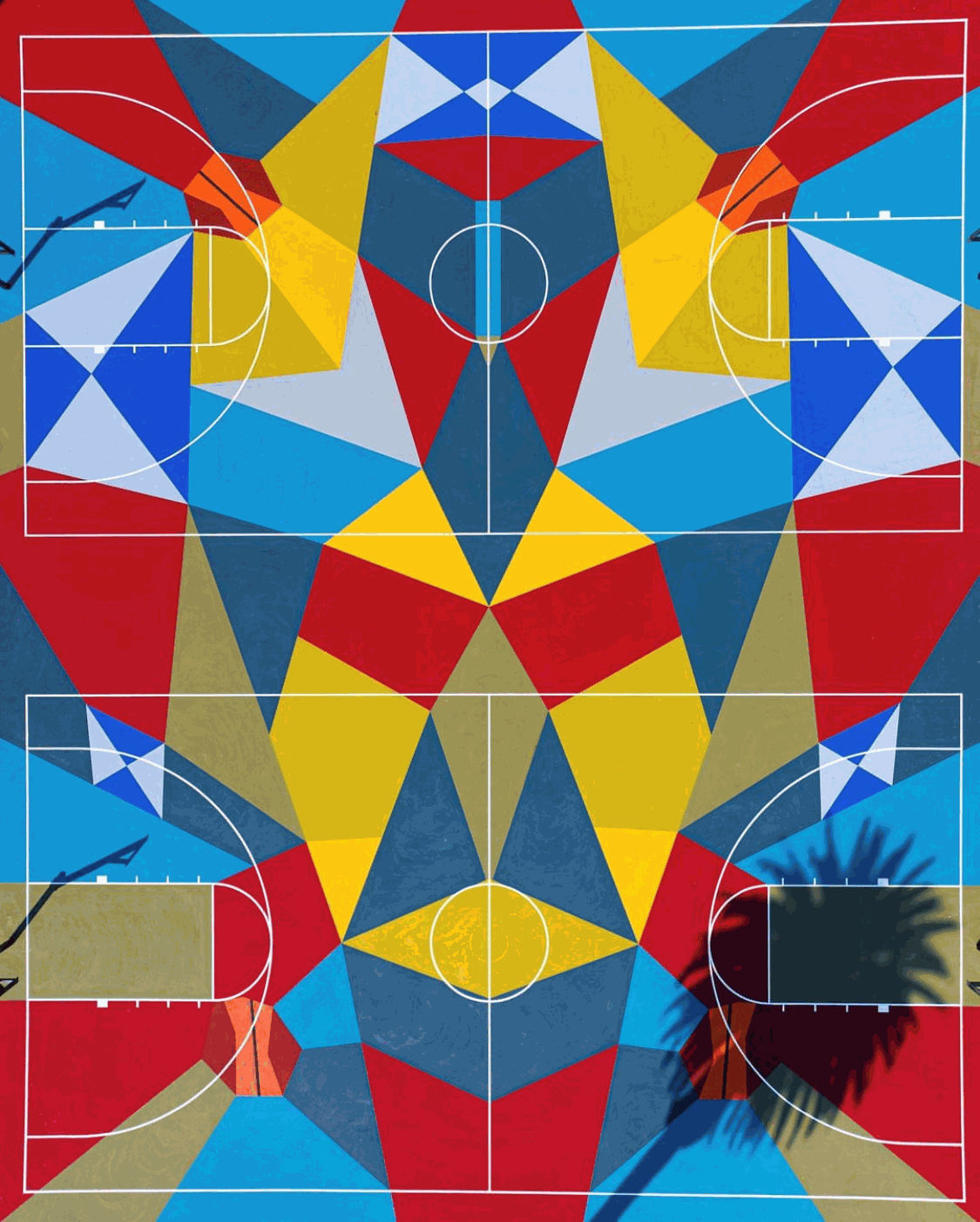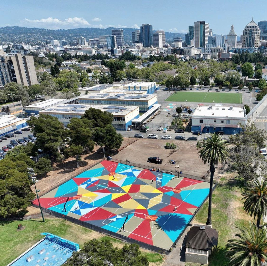 Artist Adia Millett collaborates with nonprofit organization Project Backboard on a special Oakland basketball court mural, a large-scale site-specific artwork on a public basketball court in Lowell Park, California. Project Backboard hopes to strengthen communities, improve park safety, encourage multi-generational play, and inspire people to think more critically and creatively about their environment.