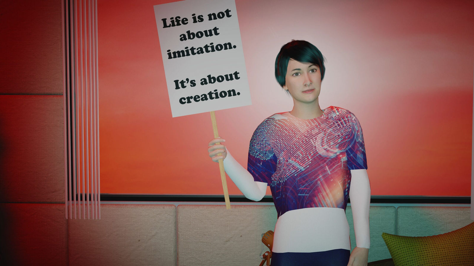 As she multitasks throughout the day, Andra8 is monitored and surveilled, finding herself overwhelmed by a web of global client demands. Something begins to trouble Andra8: her life depends on her compulsory consumption and output of human data – or so she’s been told.