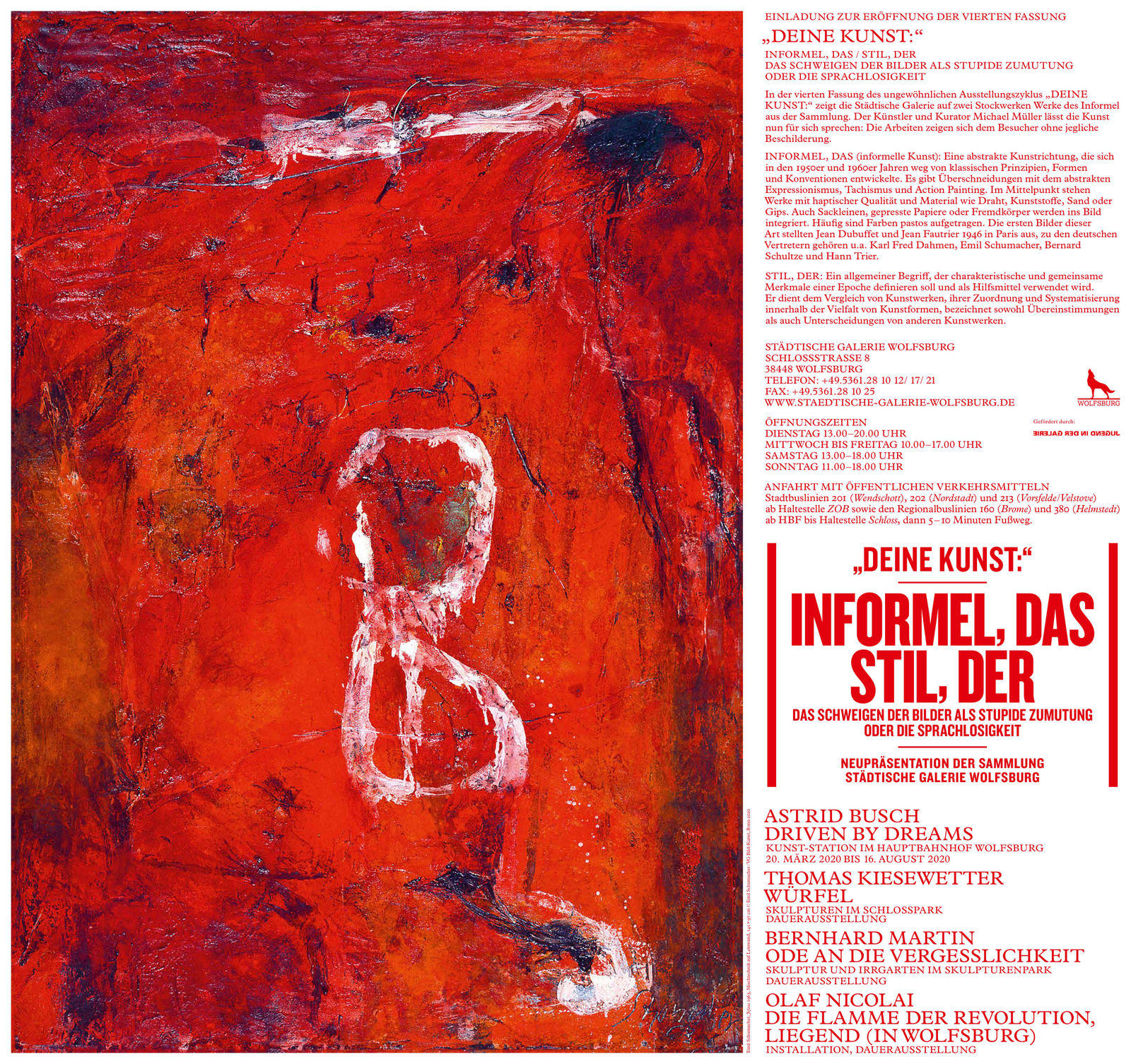 Art Informel is a key development in the realm of visual art after 1945. After the Second World War, the world was disoriented. Fascism has turned progressive artistic tendencies to a standstill in Europe. There were persecution, ostracism, expulsion or even murder of artists – the art world was calling for a radical reorientation. In turning away from form, representation and theory, the focus was now on material, signs and gestures. Gestural painting and drawing as an act of departure as well as individual and artistic liberation developed simultaneously in Europe and America. Pioneers and important artists of this art movement are represented in the collection of the Städtische Galerie Wolfsburg, selected works by 19 artists have been featured in the fourth chapter of DEINE KUNST.
